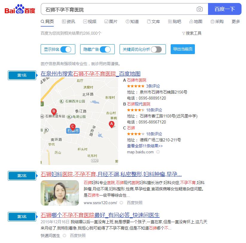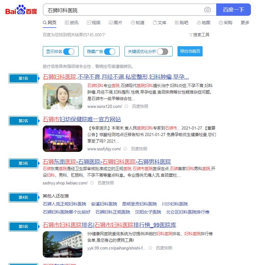 石獅現(xiàn)代醫(yī)院婦科以前的老網(wǎng)站做過一段時間的競價(jià),效果并不好后就沒有怎么維護(hù),網(wǎng)站優(yōu)化這塊一直沒做,相信目前不少公司的情況都這樣,公司網(wǎng)站沒有專人優(yōu)化。石獅現(xiàn)代醫(yī)院和南安市武榮網(wǎng)絡(luò)技術(shù)有限公司簽約以后,我們通過商討并決定舍棄之前的一切,因老網(wǎng)站有許多處違規(guī)、界面用戶體驗(yàn)差、部分頁面被惡意篡改、通過搜索引擎搜索任何關(guān)鍵詞,包括品牌詞都無法搜索到相關(guān)排名信息等諸多問題!所以重新操刀設(shè)計(jì)建設(shè)新的網(wǎng)站,時間操作有一個月左右,通過偽原創(chuàng)內(nèi)容、功能添加、網(wǎng)站SEO優(yōu)化等等一系列運(yùn)作,波折還是比較多的,就不再多贅述了,經(jīng)過努力客戶指定的關(guān)鍵詞排名均在百度首頁!