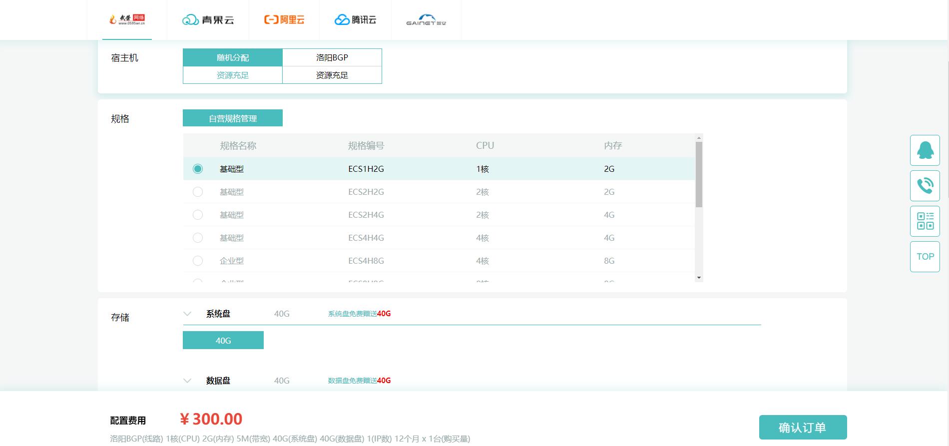 | 2G | 1核 | 40G | 5M | 300元/年 | 連接 |